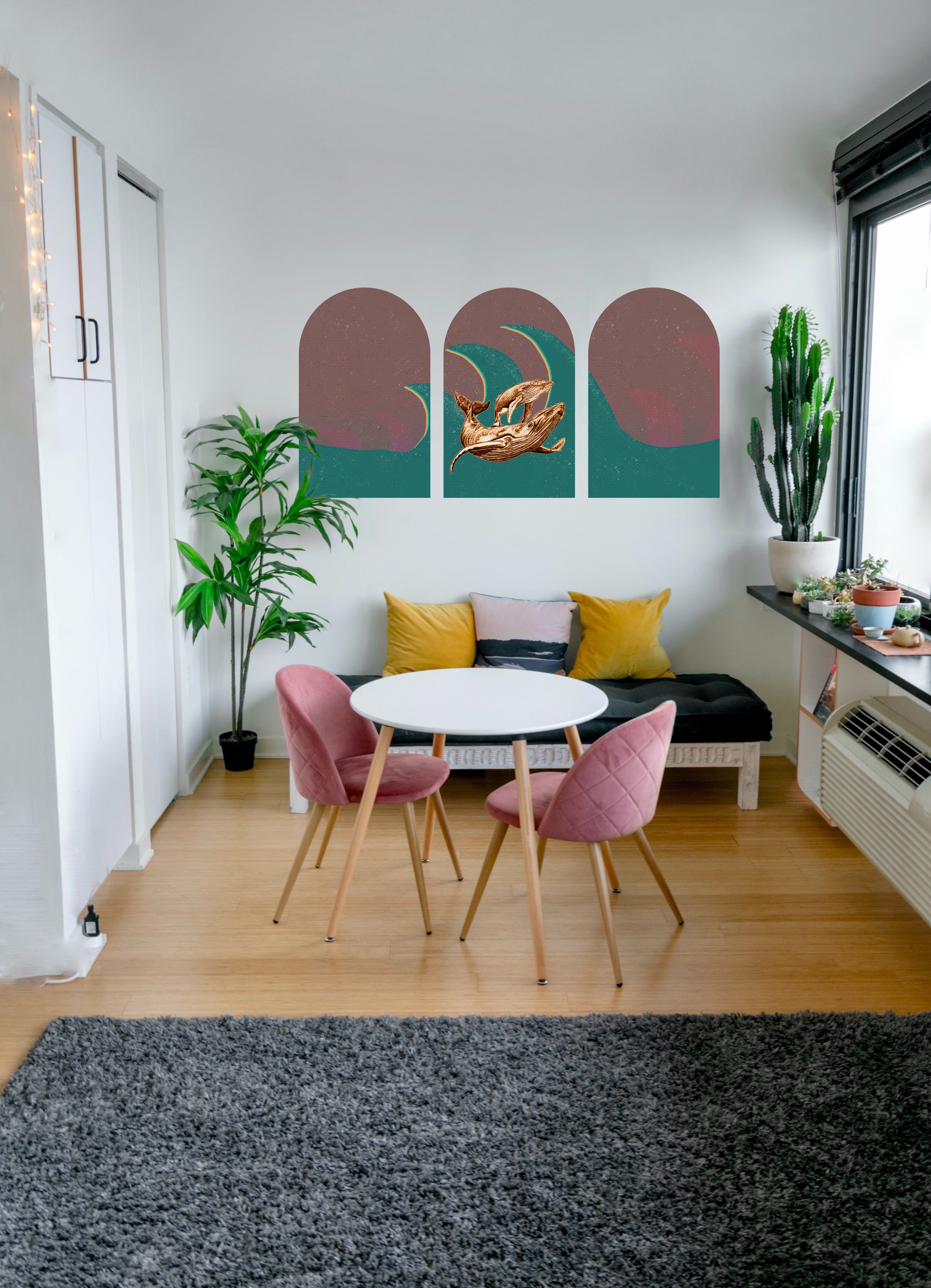 Say hello to our Ocean Groove removable wall decal. It is a wall decal design inspired by a mother and baby humpback whale, seen while on a trip back from the Broken Group Islands scattered in the centre of Barkley Sound, British Columbia. This piece is a mix of originally woodburned artwork of the whales and some retro coloured waves and splashes to spice up your living space. Place it on dark coloured walls, a pacific coast inspired room, or your new dorm, and see how much art can contribute to our everyday world.